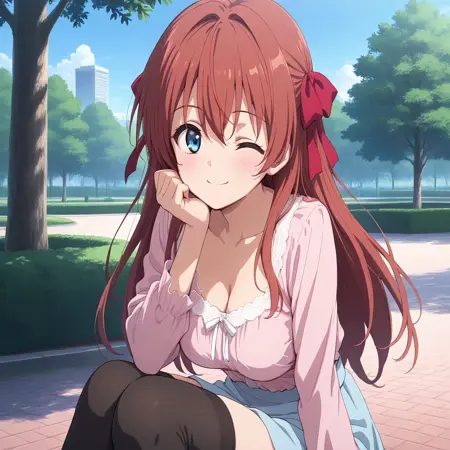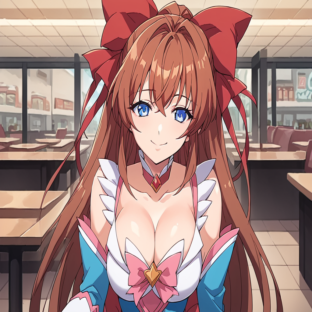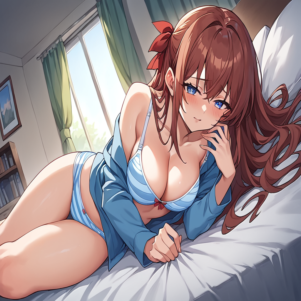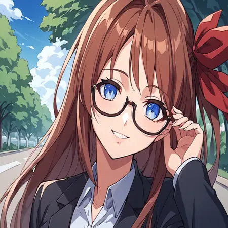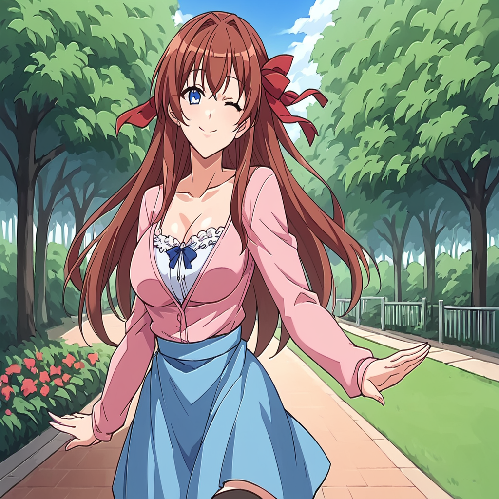 akane, 1girl, 파란 눈, 갈색 머리, 긴 머리, 빨간 머리 리본