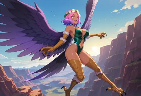 タグ:Zenker、ショートヘア、ピンク髪、パープル髪、グラデーション髪、ハーピー、パープルの目、爪、翼を広げた、尾羽、頭の輪、爪、モンスターガール、肌の黒い女性、グリーンのレオタード、羽ばたいた翼、動物の手、多色の翼、肩出し、へそ開き、鳥の尾、鳥の足
