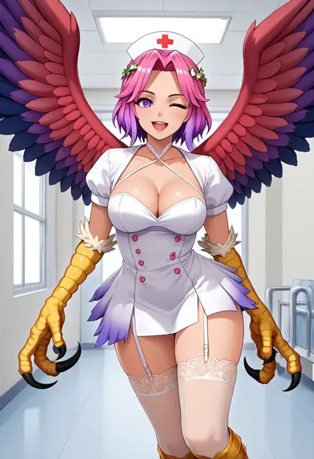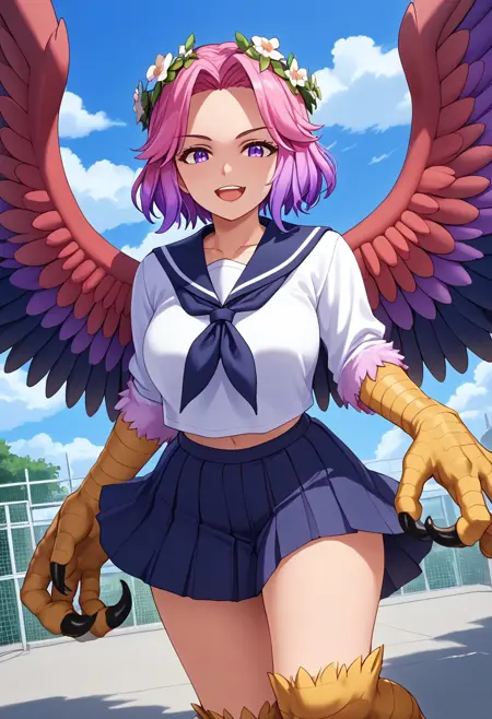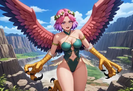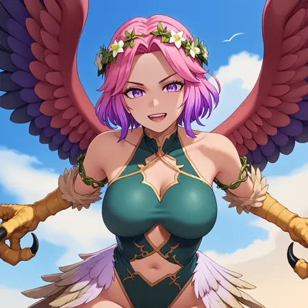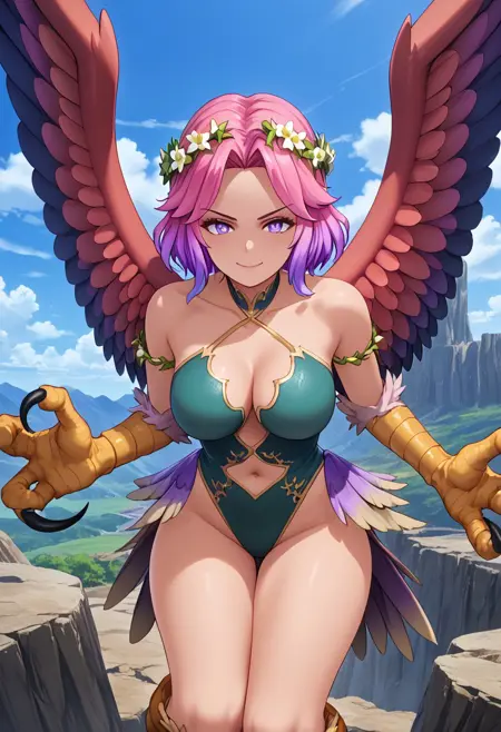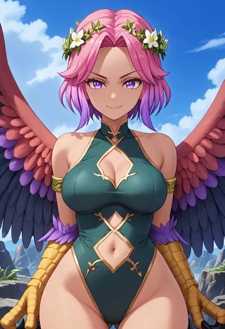 태그: 젠커, 단발, 분홍색 머리, 보라색 머리, 그라데이션 머리, 하르피에, 보라색 눈, 발톱, 펼쳐진 날개, 꼬리 깃, 머리 화환, 발톱, 몬스터 걸, 검은 피부 여성, 녹색 레오타드, 깃털 날개, 동물 손, 다색 날개, 어깨 노출, 배꼽 컷아웃, 새 꼬리, 새 다리,