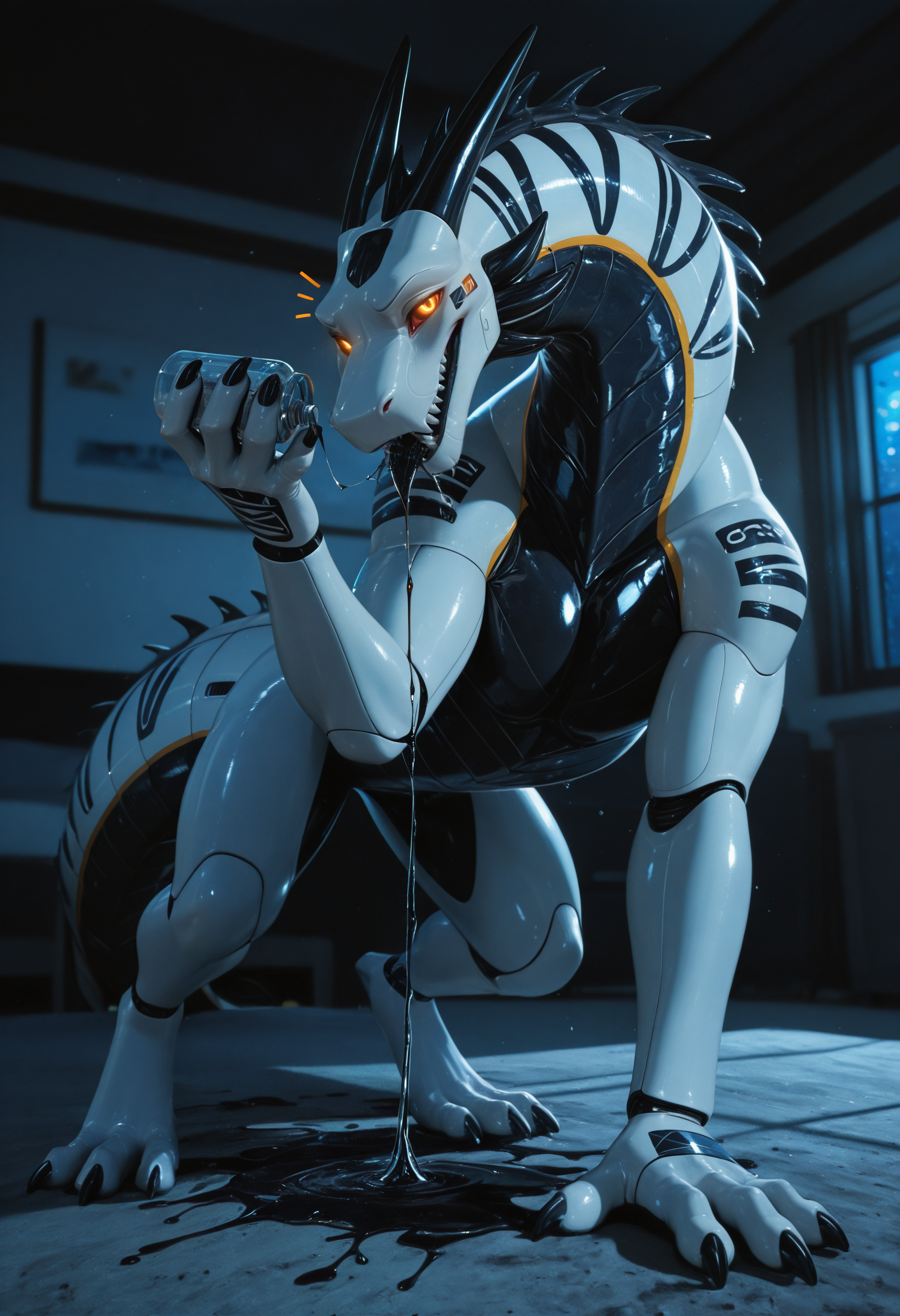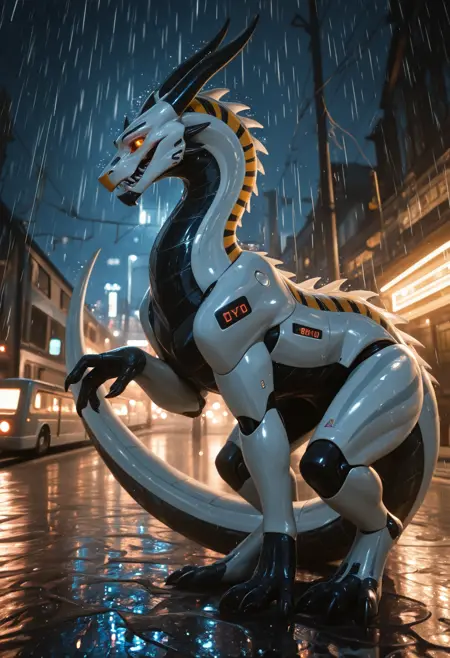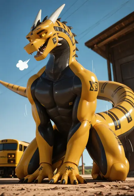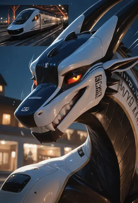 htdyt, 1boy, solo, feral, male focus, vehicle, living vehicle, scalie, hi res, train, robot dragon, dragon, scales, horn, scale markings, reptile, living machine, stripes, tail, looking at viewer, sharp teeth, colored sclera, inscriptions, glowing eyes