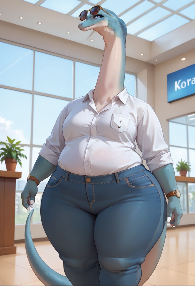 score_7_up, score_8_up, score_9, brontosaurus, 1boy, male, long neck, gradient scales, scalie, long neck, blue eyes, long nose, White nails, big belly, big boobs, overweight, nipples, plump, wide hips, thick thighs