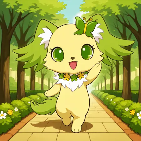 chibi, feral, digitigrade, furry, green winged ears, yellow fur, yellow body, green tail, white inner ear fluff , green butterfly clip, white chest fur, flower garland around neck, green eyes,