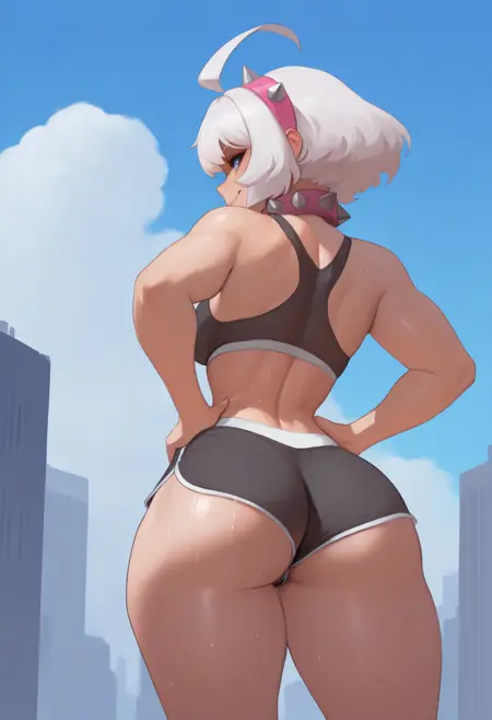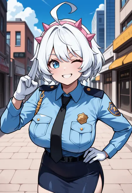 Trigger + Appearance: strivelpht, short hair, white hair, huge ahoge, pink hairband, spiked hairband, blue eyes, large breasts