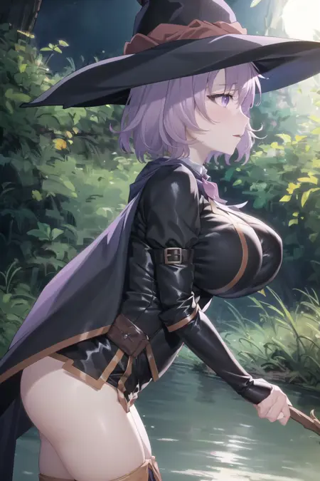detached_sleeves,fingerless_gloves,boots,witch_hat,holding_wand,cape,purple_hair, purple_eyes, 全身装备