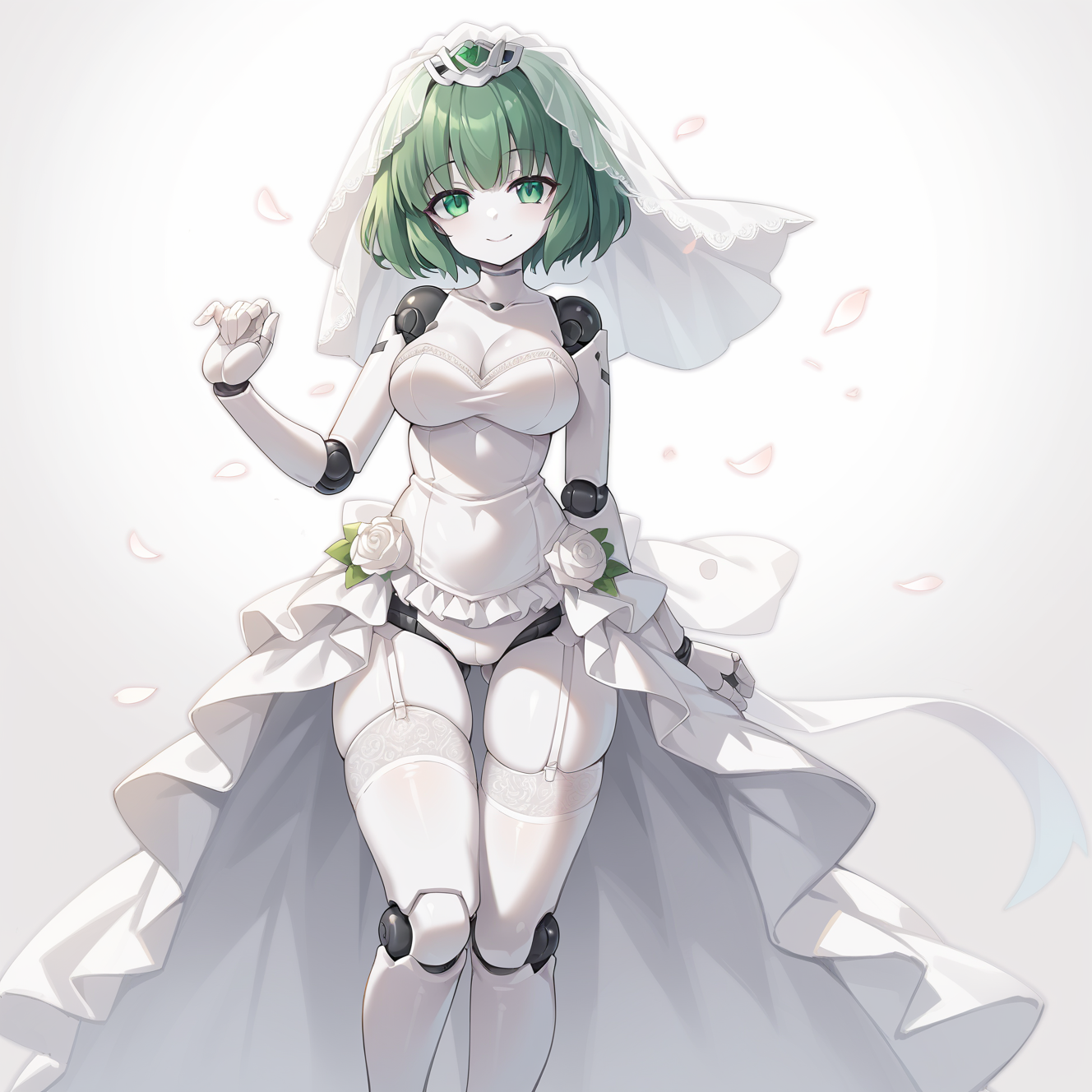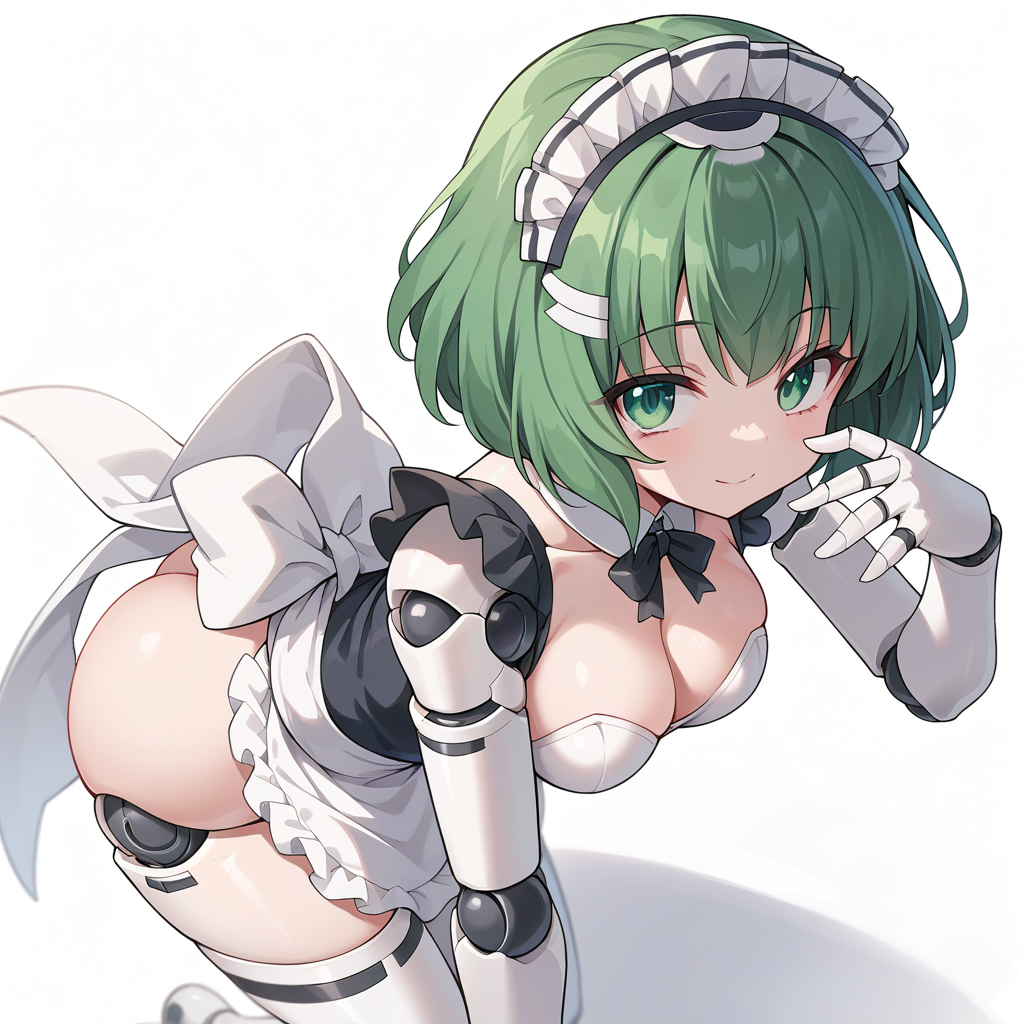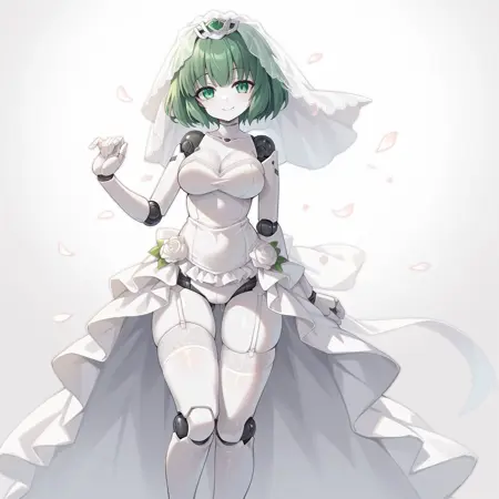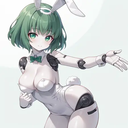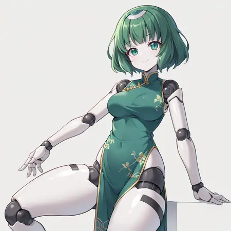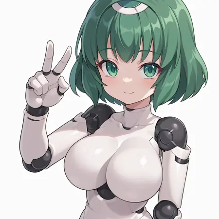 polynian iana, green hair, short hair, green eyes, robot girl
