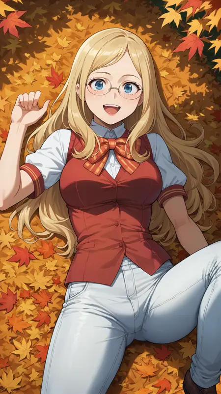 long hair, blonde hair, blue eyes, round glasses, red vest, white sleeves, short sleeves, red bow, white jeans, white pants