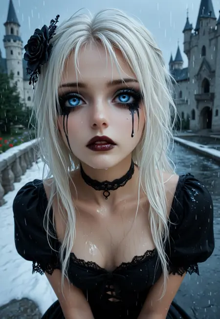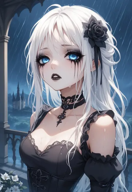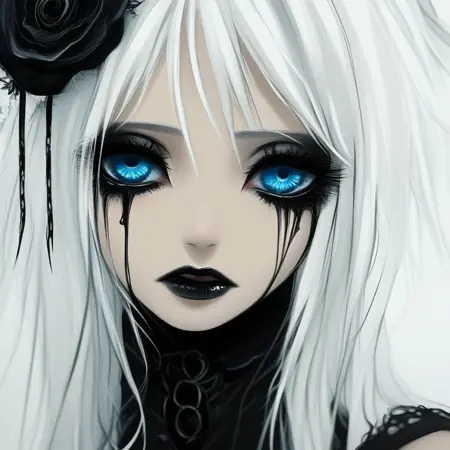 标签:Axiomamb,蓝眼睛,白发,长发,睫毛,妆容,发饰花,花朵,黑花,