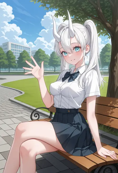 KJOlime, 白髪, 青い目, 角, 目の間の髪, 長い髪, ツインテール,