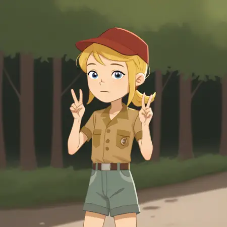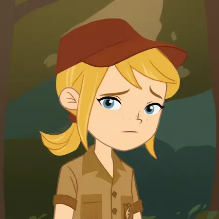 Lottie, 1girl, solo, blonde hair, short ponytail, blue eyes, red hat,