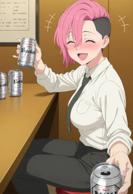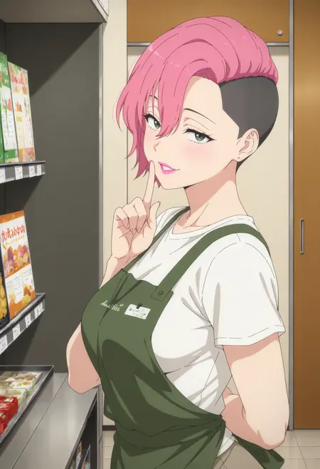 KJOchika, pink hair, green eyes, hair between eyes, short hair, undercut, pink lipstick,