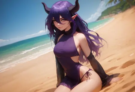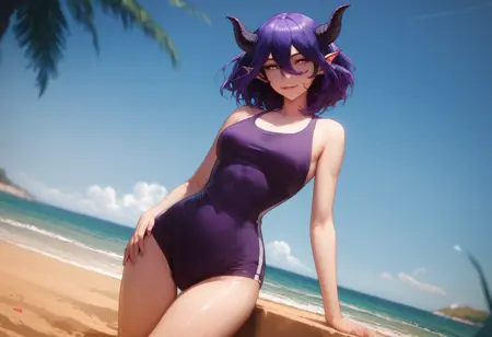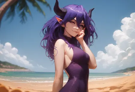 vermeil_cinn, 紫色头发,恶魔角,尖耳朵,恶魔女孩,头发位于双眼之间,裸露肩膀,无袖