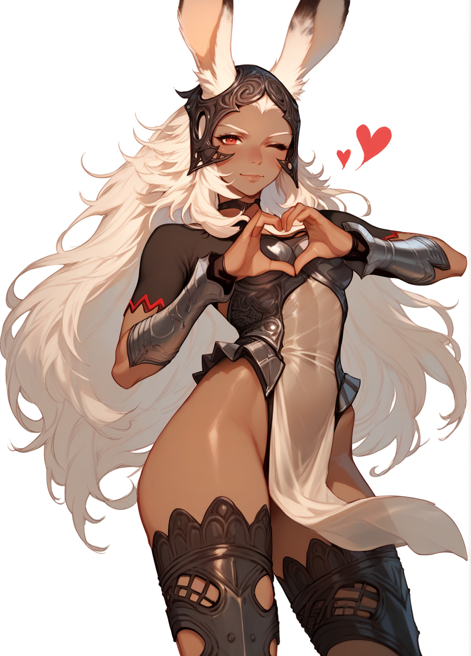 1girl, solo, viera, 검은 피부, 흰색 머리, 긴 머리, 붉은 눈