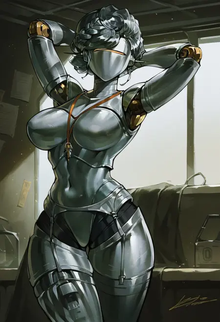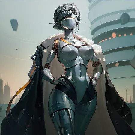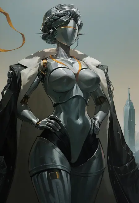 タグは「Lucy_R1999、人型ロボット、無表情、短髪、灰色の金属質の髪、編み髪、ロボット関節、大きな胸」です。彼女の唯一の衣装は「コート、肩にかけたコート」を使用してください。