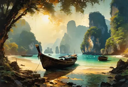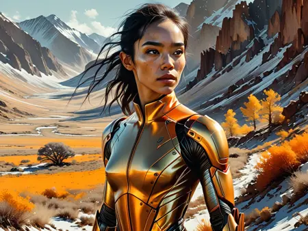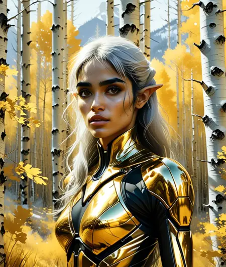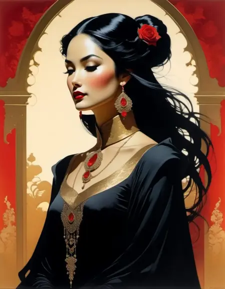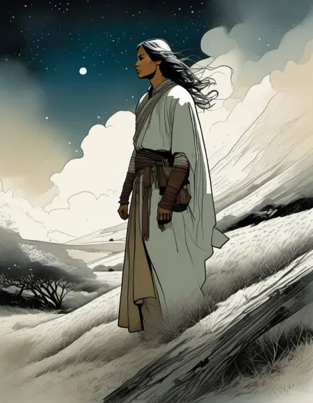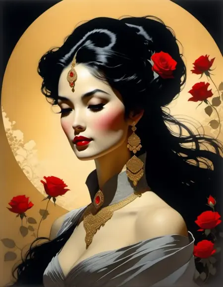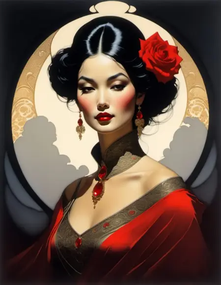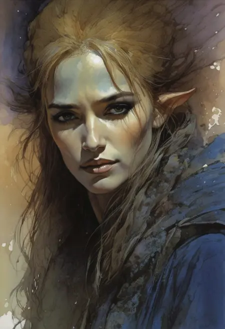 종종 잉크와 수채화의 튀김, 극적인 그림자, 흰 배경, 색상이 있는 하늘과 구름, 빛나는 효과, 대비 및 반사가 보입니다. 풍경, 식물, 머리카락은 그림자와 선명한 정의로 복잡하게 표현됩니다.