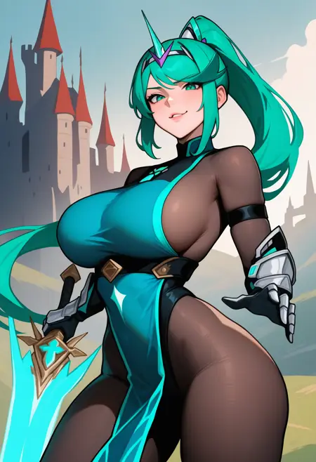 pnmdef、青い目、青い髪、長い髪、ポニーテール、ティアラ、大きな胸、アーマー、手袋