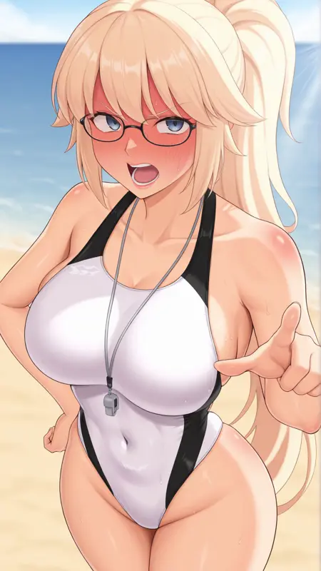jdcompswim, 파란 눈, 금발, 토끼 꼬리, 긴 머리, 흰 원피스 수영복, 경기용 수영복, 하이레그 수영복, 안경, 검은 프레임 안경, 배꼽 가린 상태, 목에 목줄,