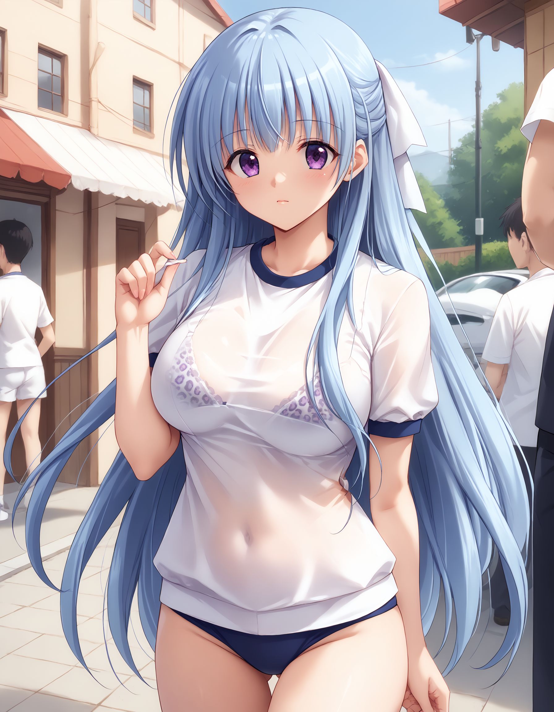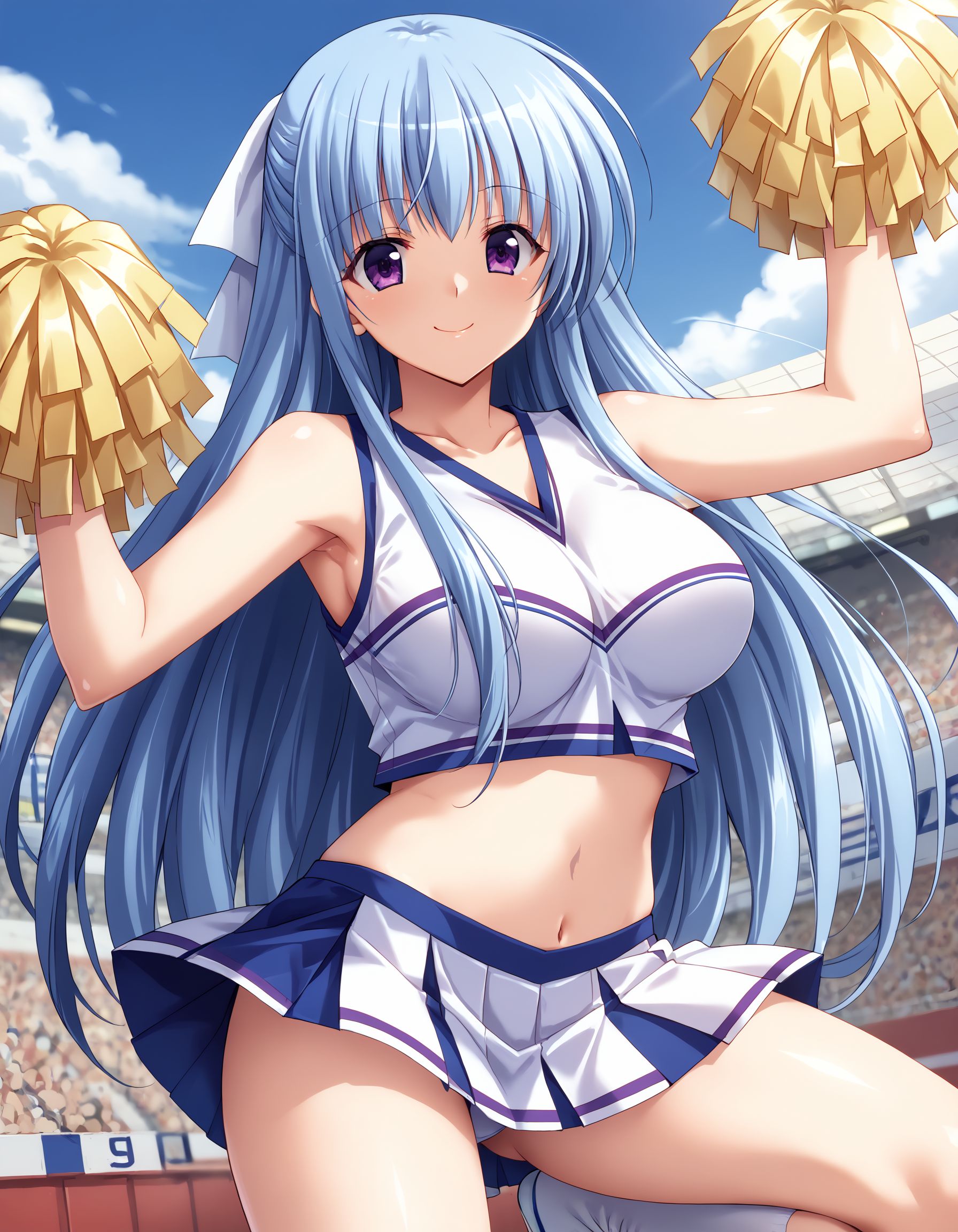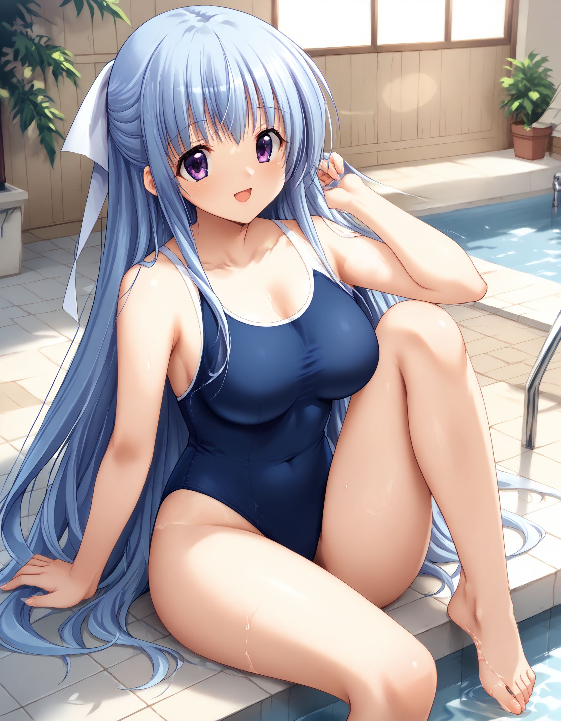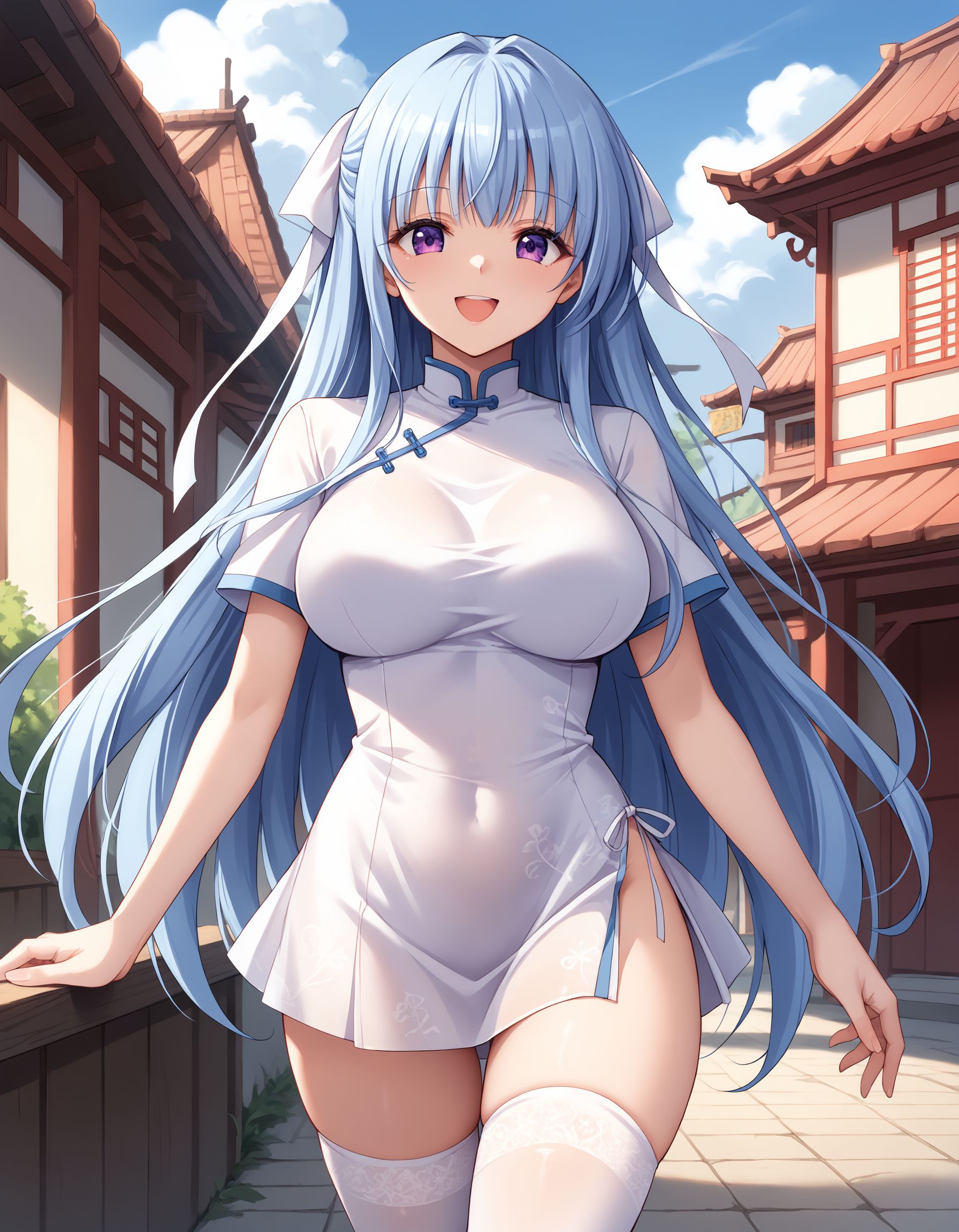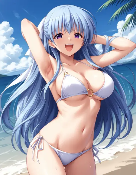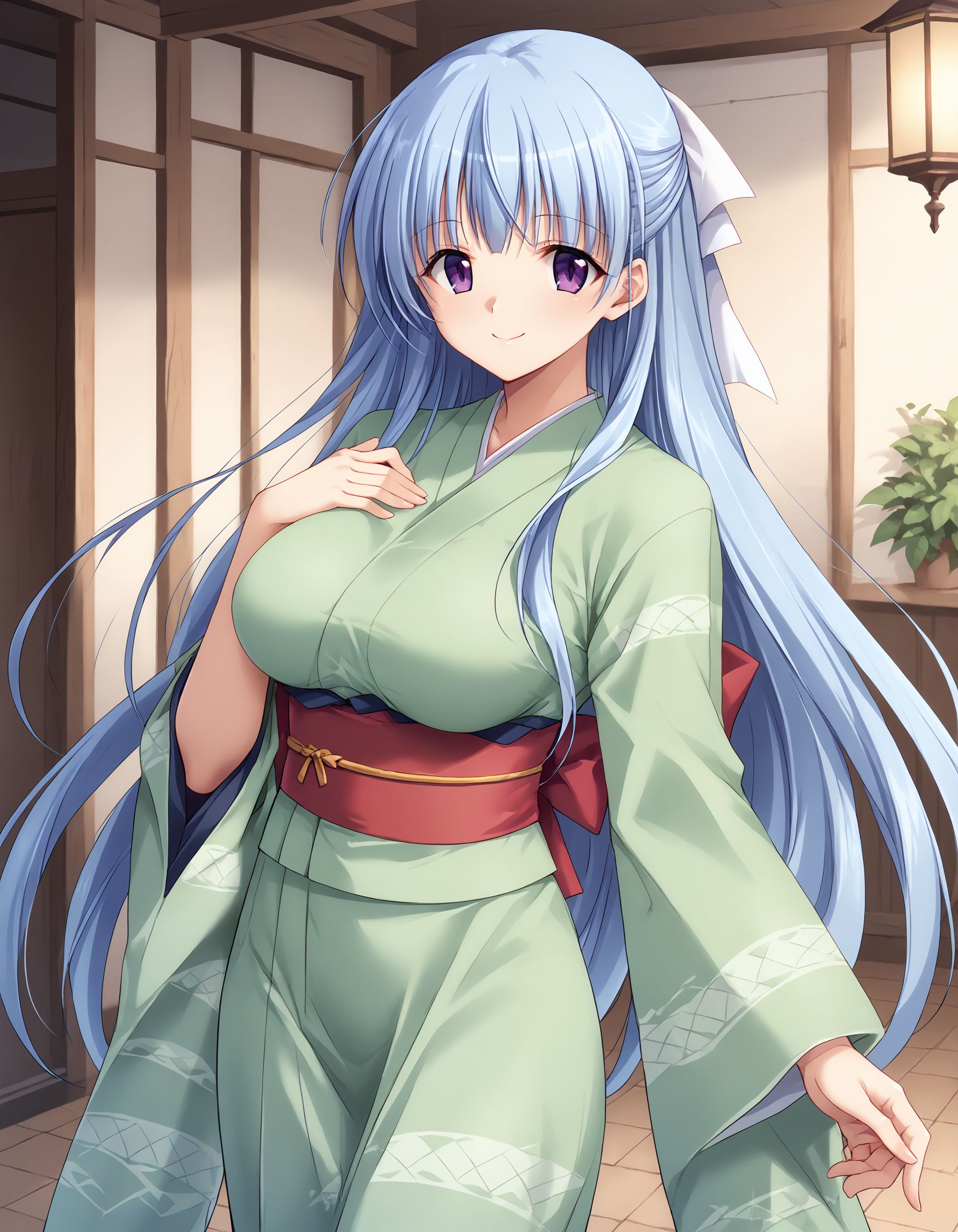 kusumi, blue hair, long hair, half up, white hair ribbon, large ribbon, purple eyes, large breasts,