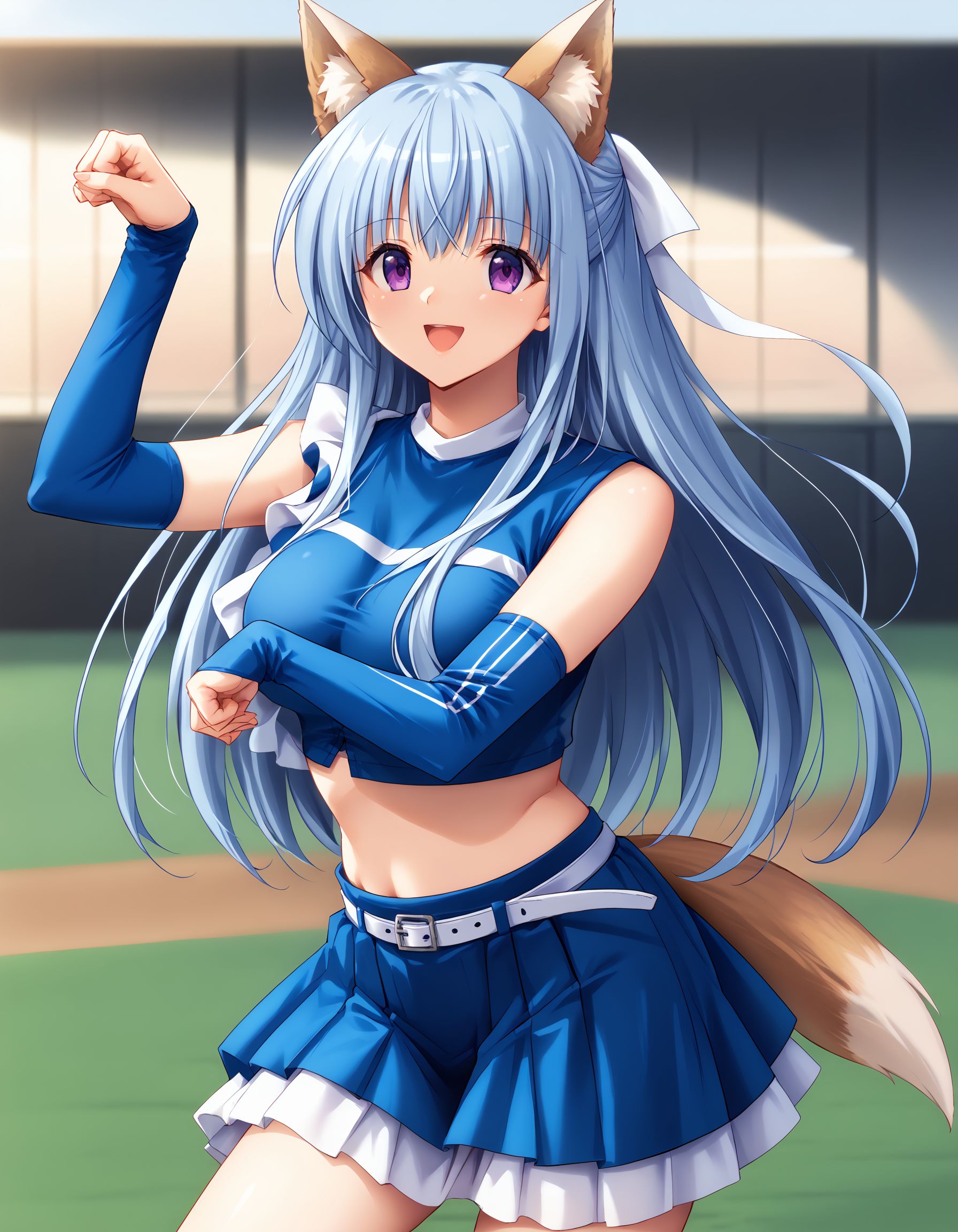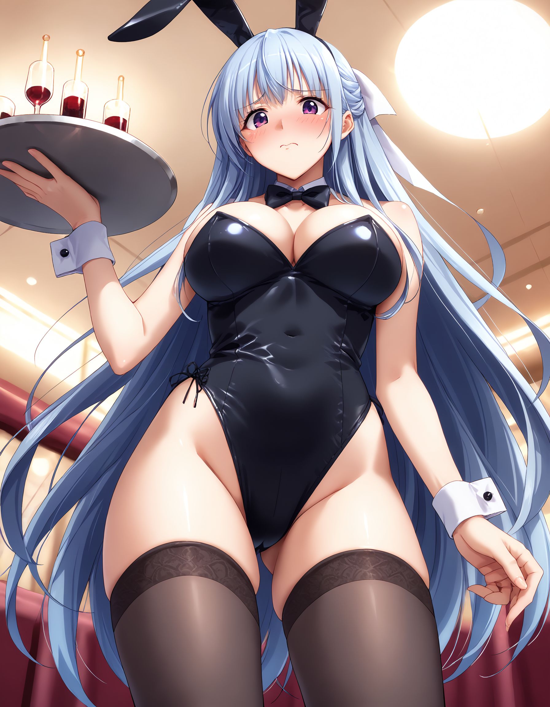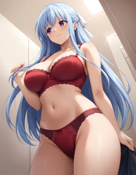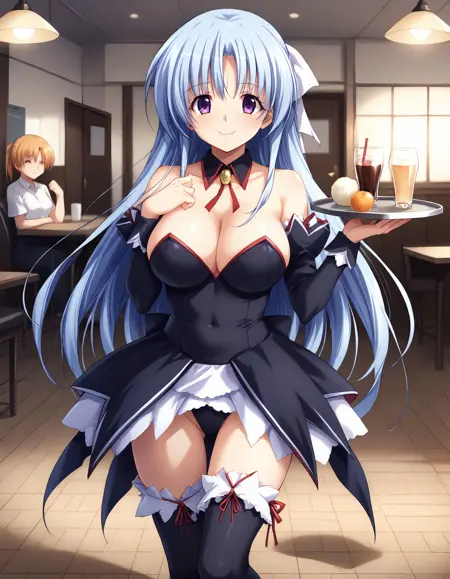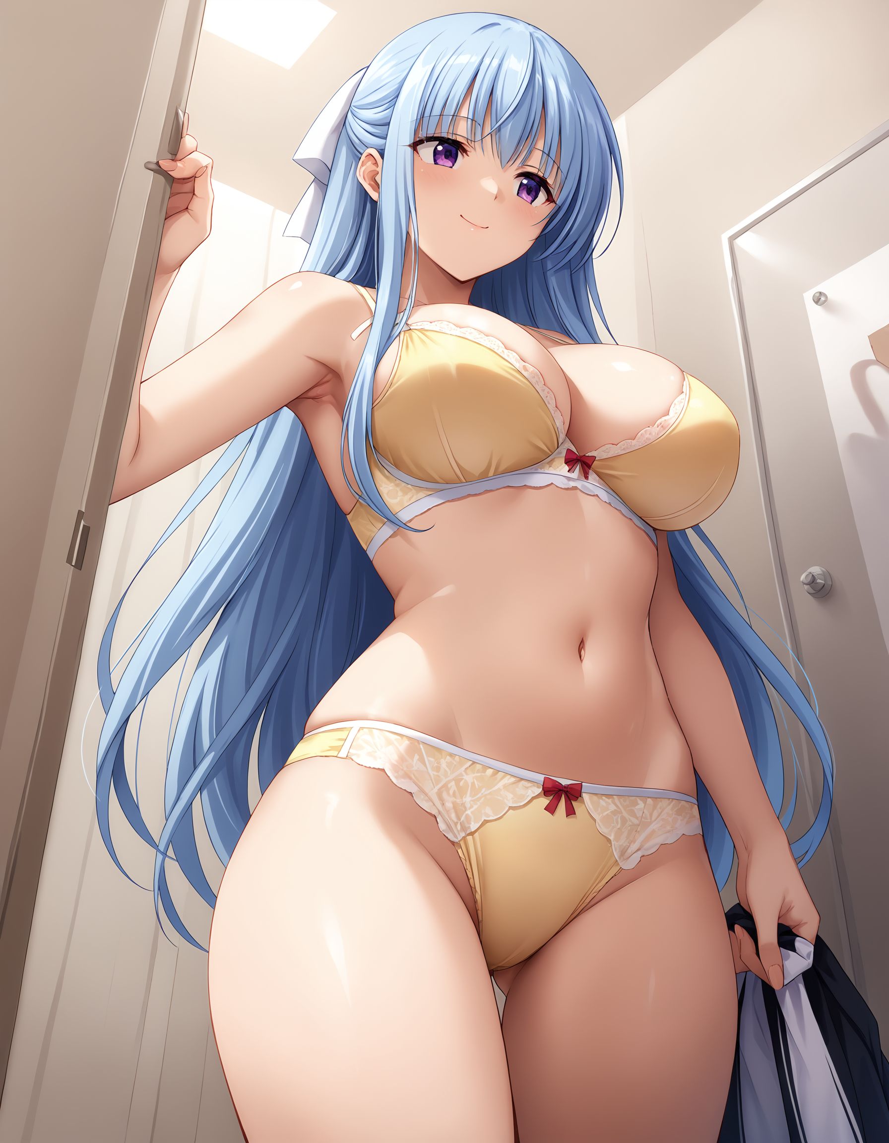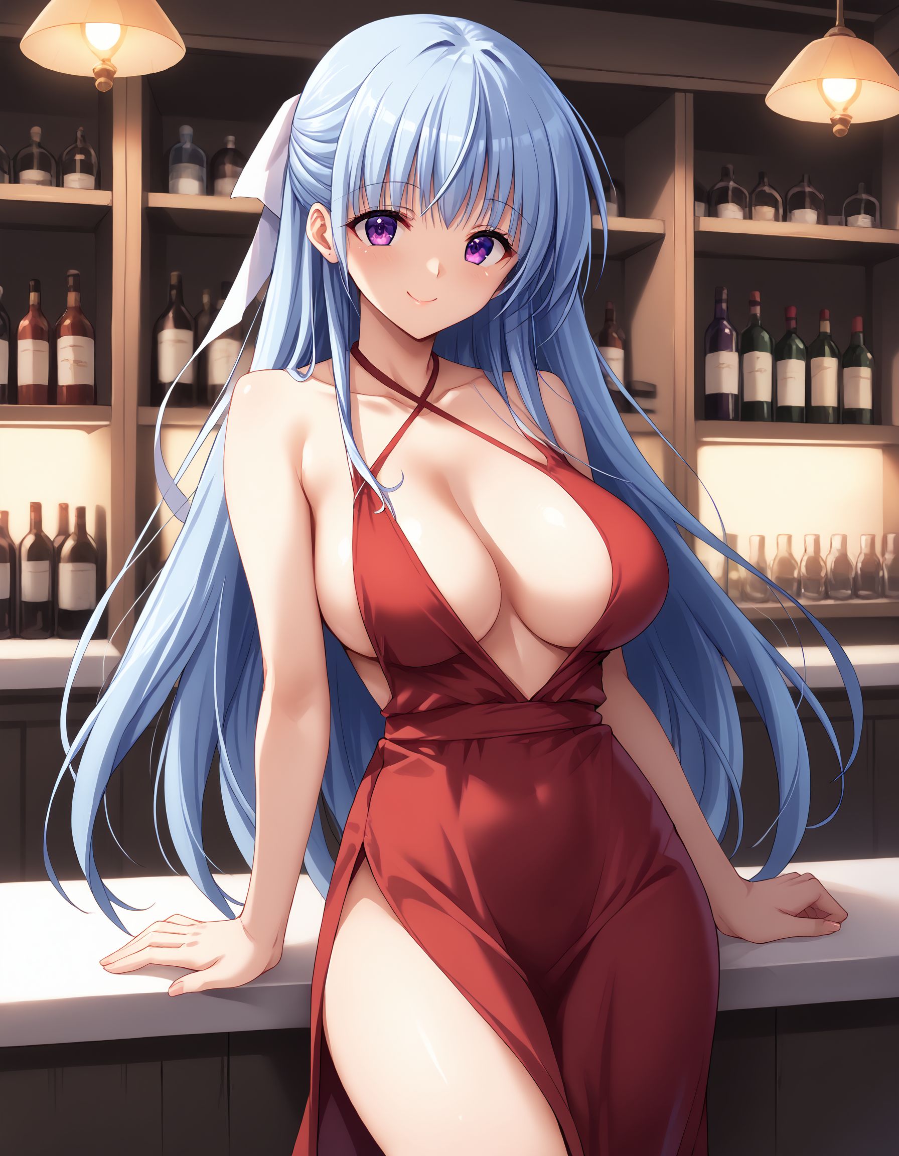 kusumi, blue hair, long hair, half up, white hair ribbon, large ribbon, purple eyes, large breasts,