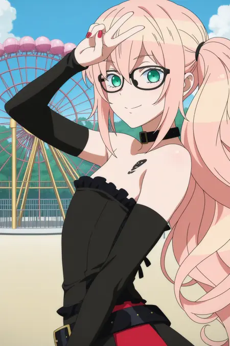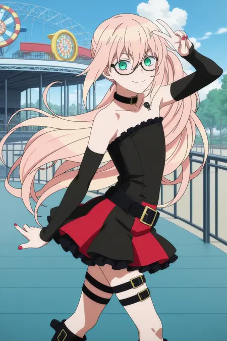 ninomiya rui, 긴 머리, 분홍 머리, 옆으로 묶은 머리, 눈 사이의 머리카락, 옆머리, 검은 프레임 안경, 녹색 눈, 검은 칼라, 문신, 빨간 손톱, 검은 드레스, 스트랩 없는 드레스, 드러난 어깨, 분리된 소매, 코르셋, 검은 벨트, 빨간 스커트, 검은 스커트, 허벅지 스트랩, 검은 신발, 무릎 부츠, 하이힐 부츠, 벨트 부츠
