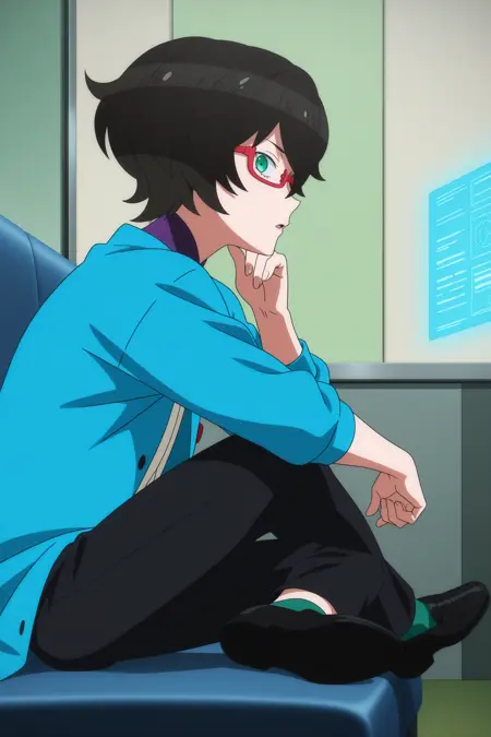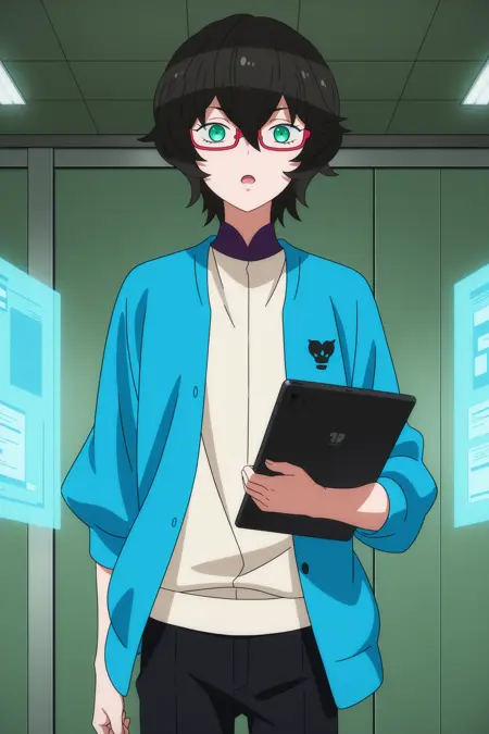 ninomiya rui, 단발머리, 검은 머리, 눈 사이의 머리카락, 빨간 프레임 안경, 반리ム레스 안경, 녹색 눈, 팔꿈치를 넘는 소매, 파란 재킷, 열린 재킷, 긴 소매, 흰 셔츠, 칼라 있는 셔츠, 검은 바지, 녹색 양말, 검은 신발