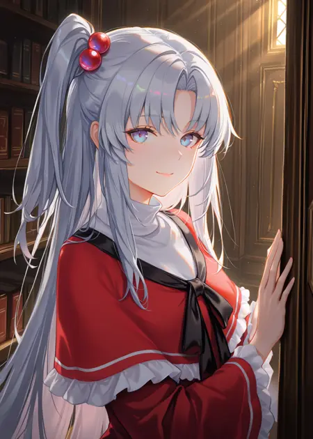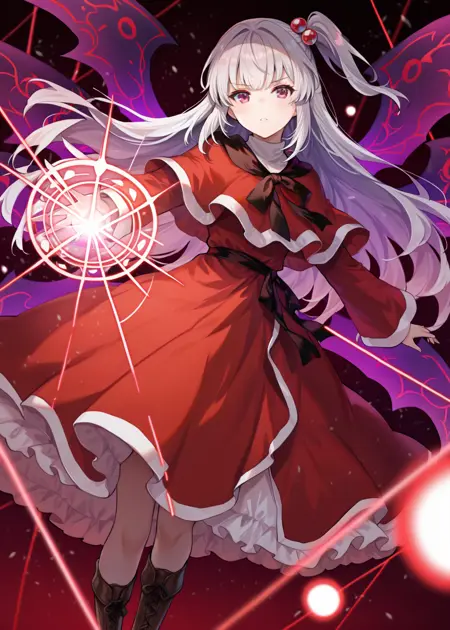 普通形态(无翅膀):shinki (touhou),长发,发饰,白发,青色眼睛,发饰,一侧高束,红裙,红披肩,(长袖),(棕色靴子)