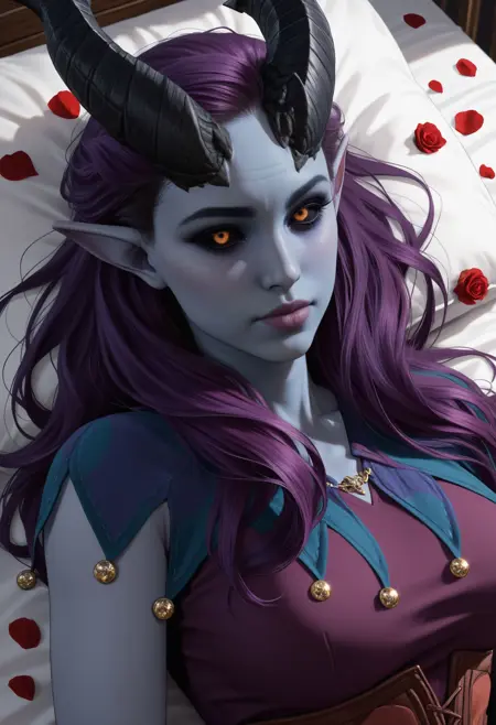 BGAlfira, 1girl, black sclera, orange eyes, demon horns, purple hair, long hair, pointy ears, blue skin