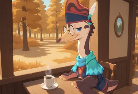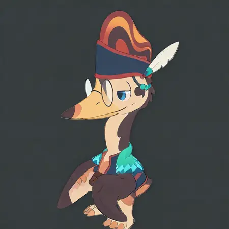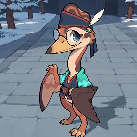 (トリガー語: ロウアン、男性、ケツァルコアトルス、茶色の肌、濃い黄色のくちばし、青い目、膜状の翼、翼のある腕、指3本、趾4本、メガネ、濃い青のベスト、グリーンのマント、ウエストバッグ、濃い青のヘッドバンド)