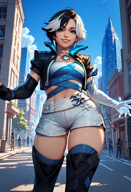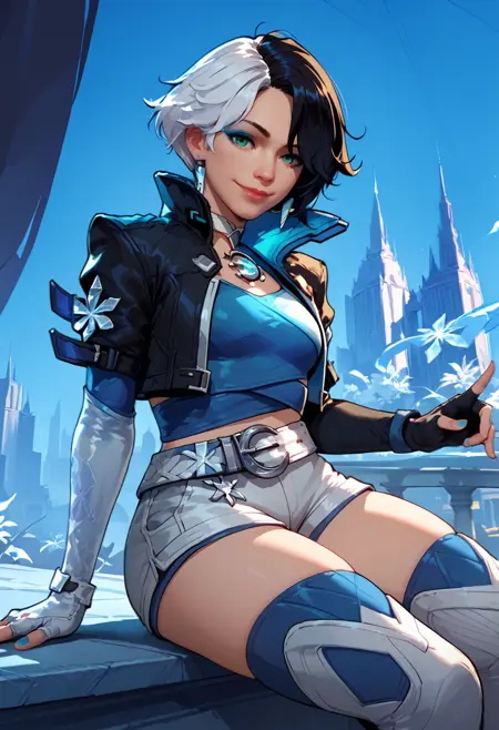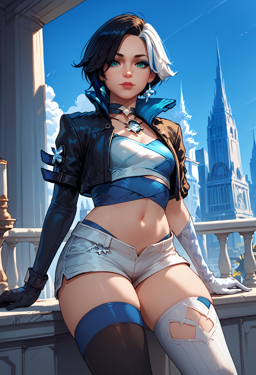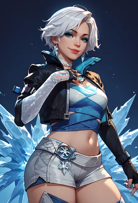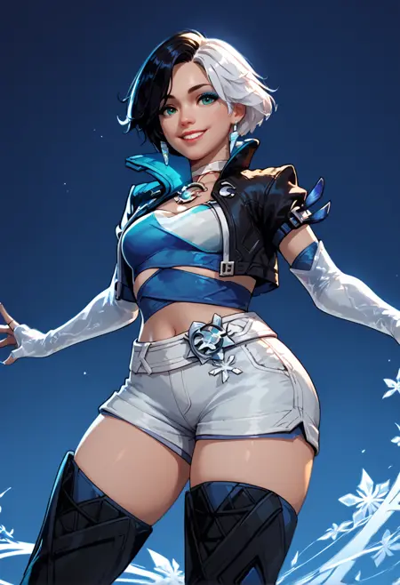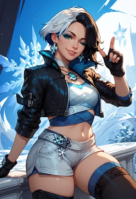 lunafrost, 1girl, solo, one eye closed, gloves, fingerless gloves, breasts, thighhighs, jacket, midriff, cropped jacket, medium breasts, shorts, black gloves, black jacket, jewelry, earrings, makeup, looking at viewer, multicolored hair, smile