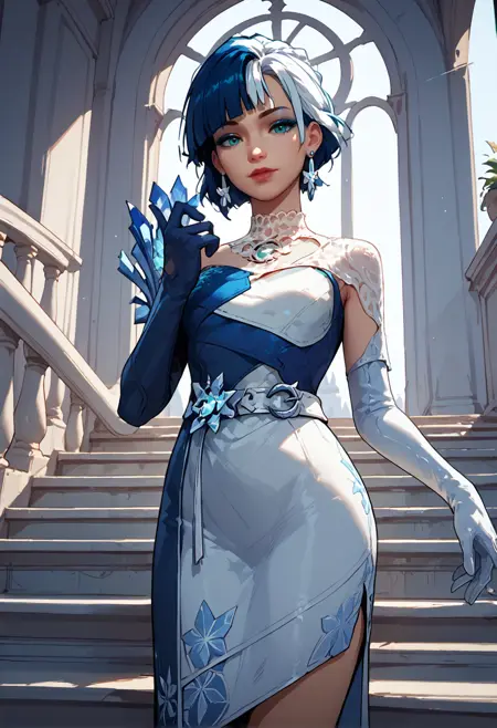 lunafrost, 1girl, solo, dress, stairs, looking at viewer, jewelry, earrings, belt, gloves, bangs