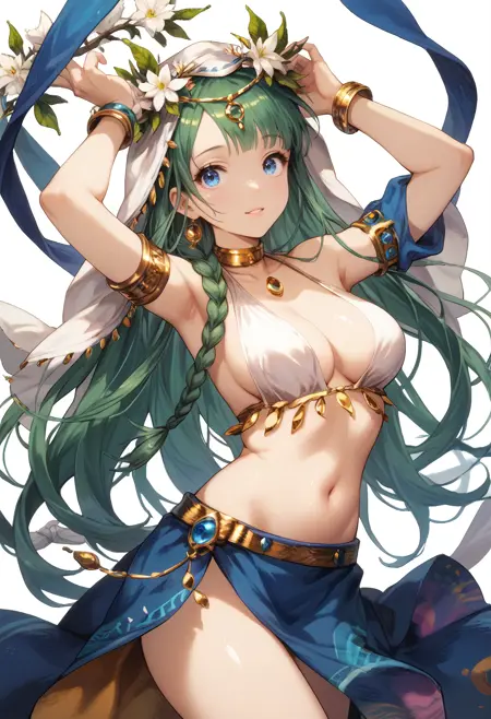 venakadancer, 큰 가슴, 녹색 머리카락, 긴 머리카락, 옆머리 땋기, 파란 눈, 파란 베일, 머리 화환, 흰색 배舞蹈 복장, 흰색 비키니, 금색 벨트, 꽃 액세서리, 파란 사롱, 맨발, 금색 목걸이, 금색 팔찌, 금색 손목장식, 금발 발목장식, 보석,