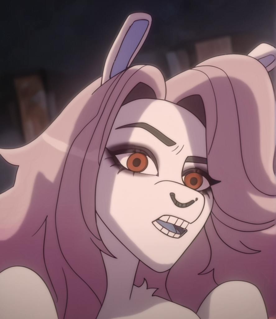 强化标签:粉发,多彩发,灰色身体,棕眼,妆容,穿孔,羽翼,尾巴**