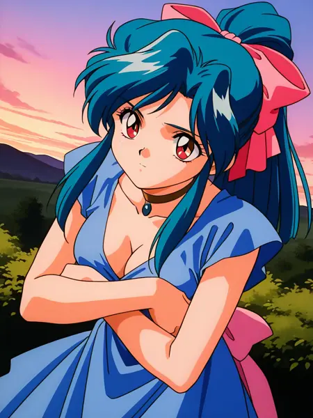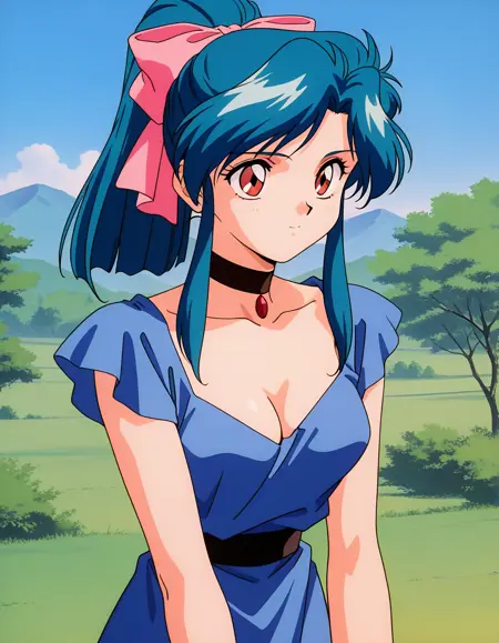 迪安娜,1girl,蓝发,长发,红眼,刘海,马尾,鬓发,中等胸部,发饰,水蓝色头发,粉红发带,1990年代(风格),动画着色,