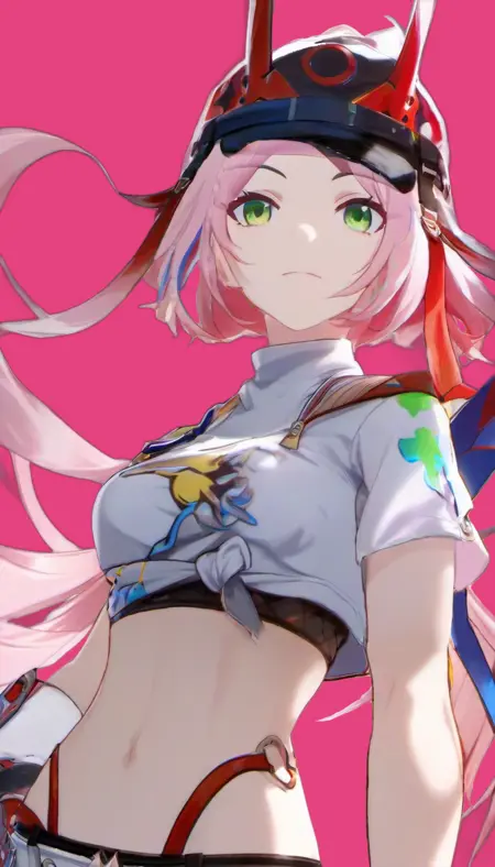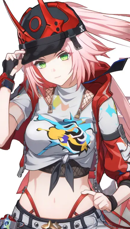 RAPPA,1girl,solo,pink hair,white shirt, short shorts,red jacket, short sleeves, streaked hair, open clothes, very long hair, helmet