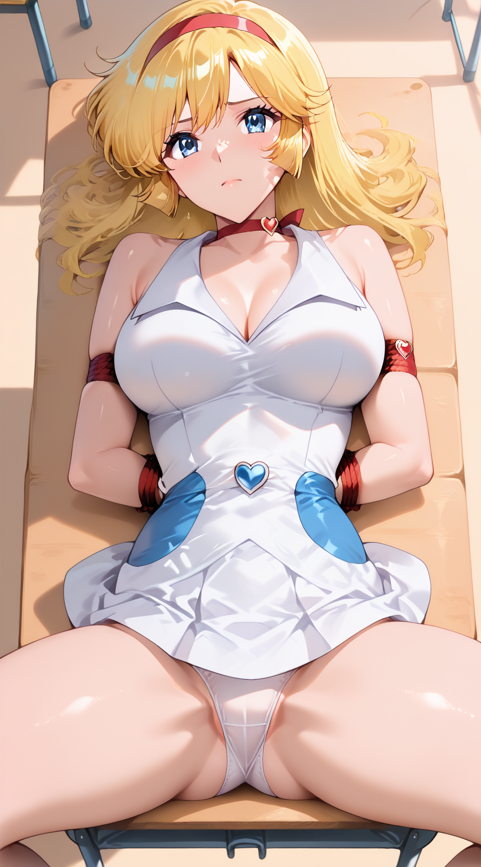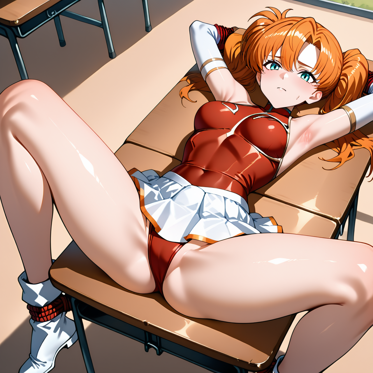 bound_to_desk, 1girl, solo, spread legs, arms to aside, rope, lying on back, breasts, on desk, school desk
