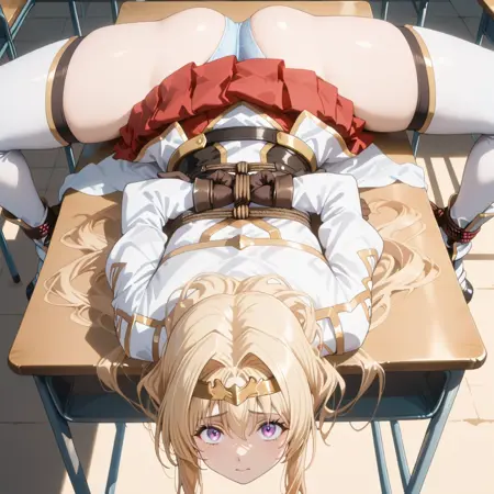 1girl , [illustirousキャラクタ名] , bound_to_desk, shoulders spreading, on back, armpits, bended elbows, arms to desk legs, ankles to desk legs, spread legs, ||upside-down || open armpits