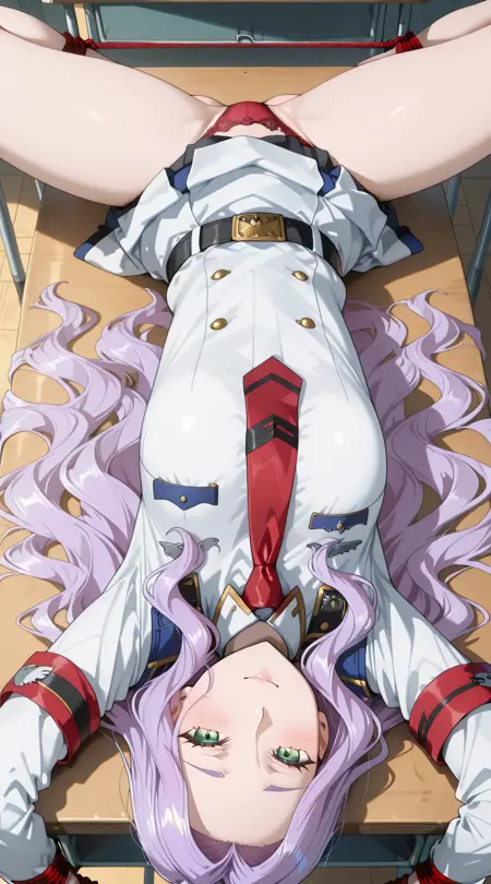 1girl , [illustirous 캐릭터명] , bound_to_desk, shoulders spreading, on back, armpits, bended elbows, arms to desk legs, ankles to desk legs, spread legs, ||upside-down || open armpits