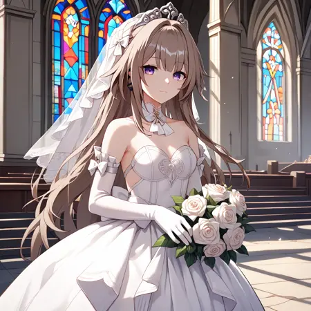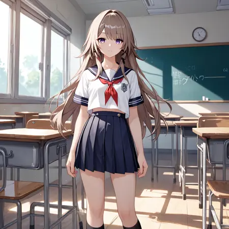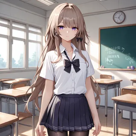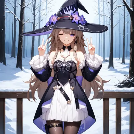 Default : the herta \(honkai: star rail\), long hair, brown hair, purple eyes, witch hat, white ascot, detached sleeves, frilled sleeves, necklace, black dress, white skirt, thigh strap, black pantyhose,