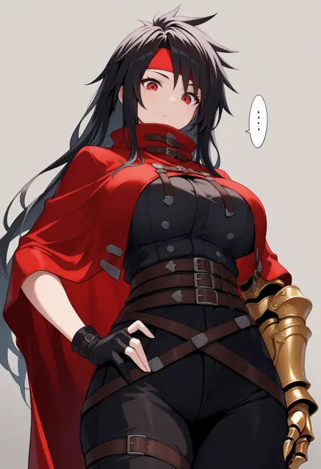 Tags are "black hair, red eyes, long hair, red headband, red headband, red cloak, buckle, black shirt, black pants, single gauntlet, multiple belts, single fingerless glove"