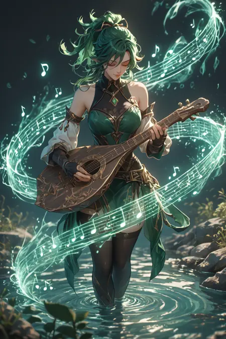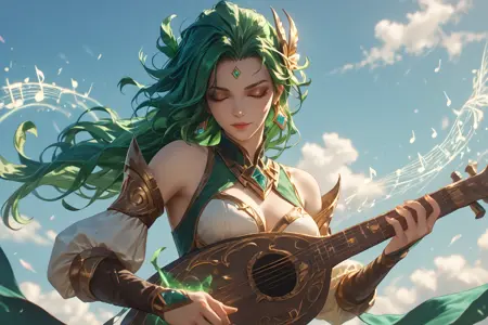 "score_9, score_8_up, score_7_up, upscale 2x, (League of Legendsの女性バードのシネマティックなショット、ローブを着て、美しい顔立ち、視聴者を見つめ、緑の目、長い緑の髪でハープを演奏中、周囲に緑の魔法の音符が飛び交い、魔法的な雰囲気を演出、緑の音符、ハープ、ハープ演奏:1.2) 素晴らしいクオリティ"