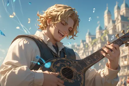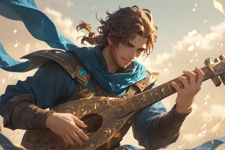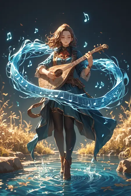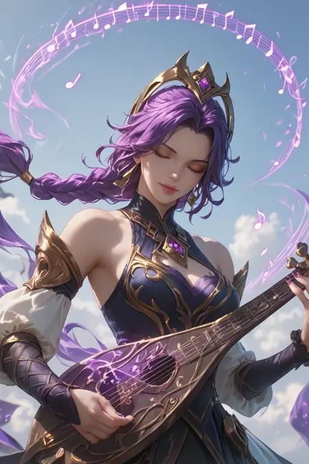 "score_9, score_8_up, score_7_up, upscale 2x, (League of Legendsの女性バードがリュートを演奏しているシネマティックなショット、美しい紫の髪、周囲に紫の魔法の音符が飛び交い、魔法的な雰囲気を演出、音符:1.2) 素晴らしいクオリティ"
