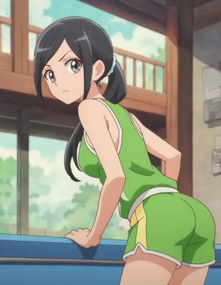 score_9, score_8_up, score_7_up, anime screencap, solo,1girl,sawaizumichiyu, green skirt, shirt, bowtie, white shirt, red bowtie, school uniform, blue cardigan, red bow, blue scrunchie, looking at viewer, hair ornament, cardigan, ribbon, lora:sawaizumichiyu:0.8