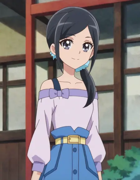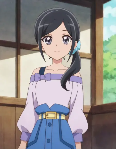 score_9, score_8_up, score_7_up, anime screencap, solo,1girl,sawaizumichiyu, hair ornament, skirt, blue scrunchie,shirt, blue skirt, collarbone, yellow belt,off shoulder, long skirt, long sleeves, off-shoulder shirt, lora:sawaizumichiyu:0.8