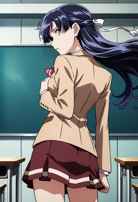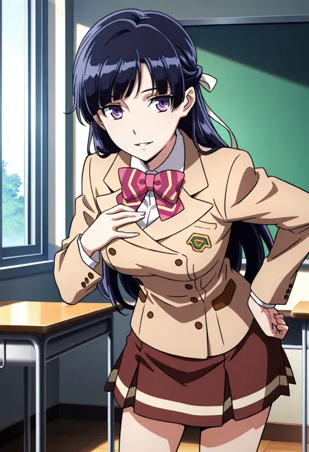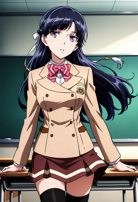 기본: rukino_sakivv, 1girl, 애니메이션 컬러링, 레트로 아트스타일, 싱글, 긴 머리, 보라색 머리, 반쯤 올린 머리, 곧은 앞머리, 머리 리본, 흰색 리본, 보라색 눈, 줄무늬 활 ties, rukino 학교 유니폼, 갈색 재킷, VV 엠블럼, 긴 소매, 플리츠 치마, 빨간 치마, 검정 허벅지양말, 젯타이 리ょう이키,