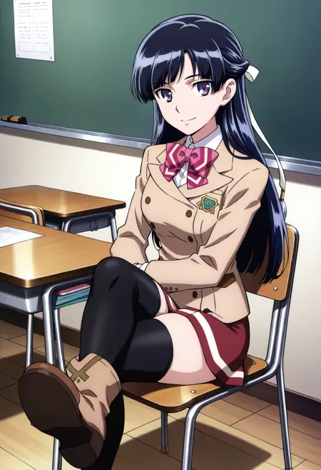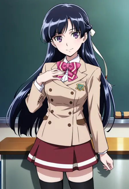 기본: rukino_sakivv, 1girl, 애니메이션 컬러링, 레트로 아트스타일, 싱글, 긴 머리, 보라색 머리, 반쯤 올린 머리, 곧은 앞머리, 머리 리본, 흰색 리본, 보라색 눈, 줄무늬 활 ties, rukino 학교 유니폼, 갈색 재킷, VV 엠블럼, 긴 소매, 플리츠 치마, 빨간 치마, 검정 허벅지양말, 젯타이 리ょう이키,