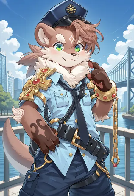 Police: police uniform,police hat,belt,jewelry,wrist cuffs,chain,