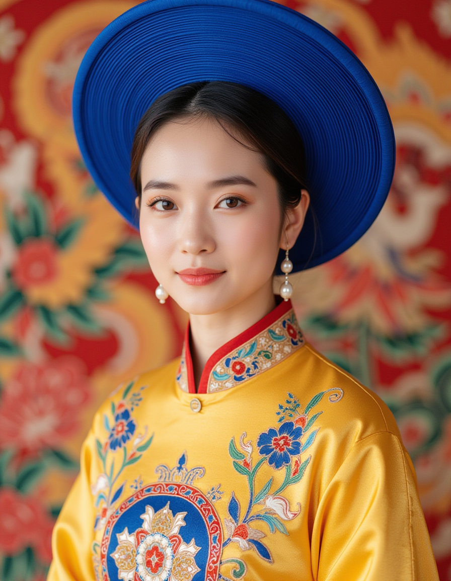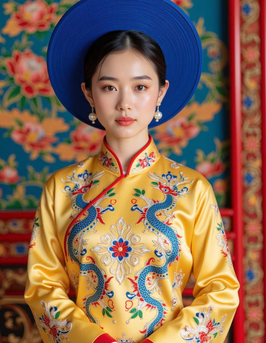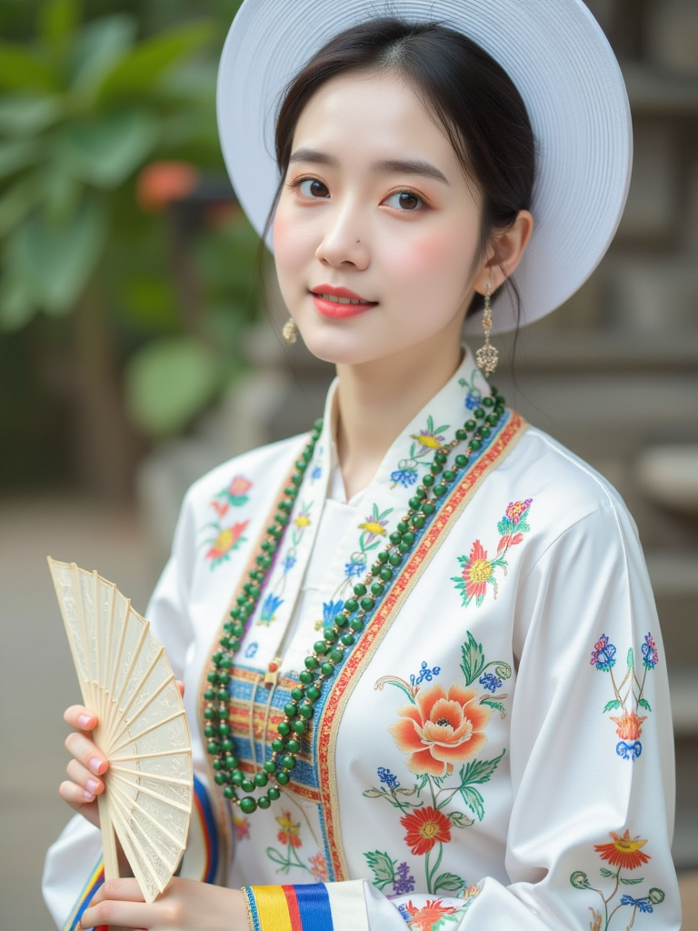 전통적인 베트남 아오 dài를 입은 여자. 푸른색, 빨간색, 노란색, 녹색으로 수놓아진 화려하고 정교한 꽃무늬와 기하학적 무늬가 장식된 흰색 로브를 입고 있다. 그녀는 층을 이룬 녹색 비즈 목걸이를 액세서리로 착용하고 있으며, 한 손에는 세밀한 무늬가 있는 부드러운 선풍기를 정교하게 들고 있고, 시선은 부드럽고 고요하다. 머리는 큰 흰색 원형 전통 모자(논 콰이 타오) 아래에 단정하게 스타일링되어 있다. 배경은 실외로, 흐릿한 녹지와 오래된 석조 건물이 있어 전체 장면에 평화롭고 문화적으로 풍부한 분위기를 더한다.