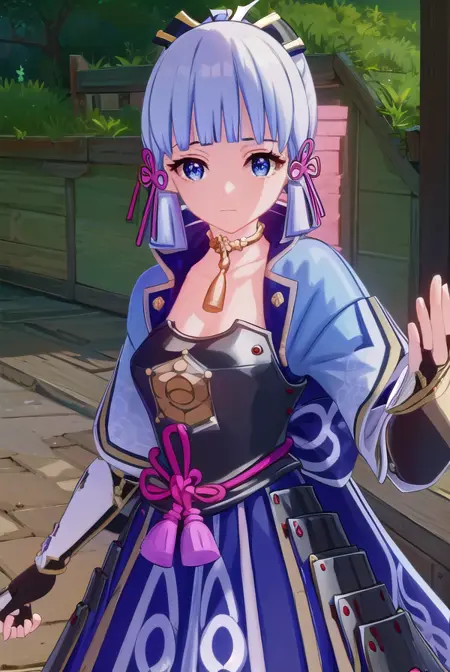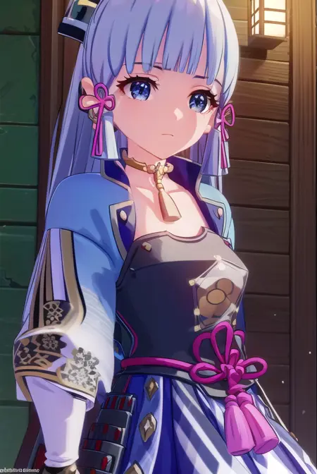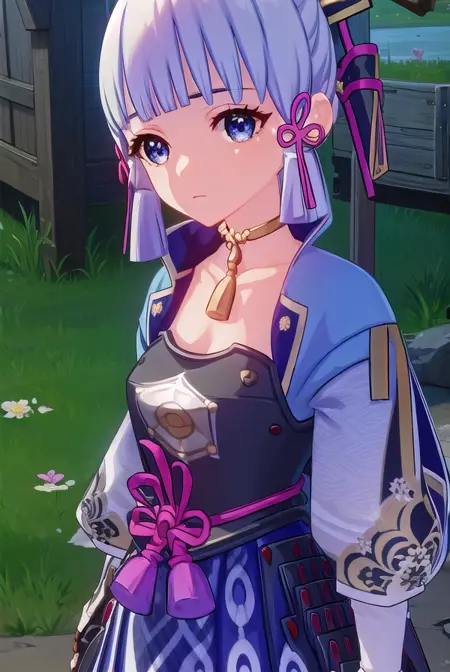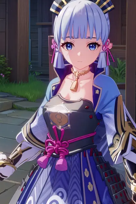 ayaka kamisato、前髪をばっさり、青い目、青い髪、髪飾り、髪リボン、髪チューブ、長い髪、ポニーテール、髪のひも