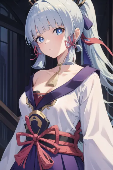 ayaka kamisato, blunt bangs, blue eyes, blue hair, hair ornament, hair ribbon, hair tubes, long hair, ponytail, tress ribbon