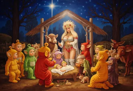 여기에는 다양한 형태의 탄생 장면이 포함되어 있습니다: 테이블 위 장식, 나무 조각, 폴리스톤/수지 조각, 그래픽 일러스트, 유화, 재미있는 액션 피규어 다이오라마, 크리스마스 조명 장치, 바티칸이 문제를 일으킨 어이없는 현대미술 작품, 그리고 고기로 만든 작품까지. 데이터셋에는 약 30개의 작품이 있습니다.