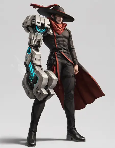• Use these triggers: sanabi, 1boy, solo, hat, hat feather, mechanical arms, single mechanical arm, long cape, long collar, short hair, black hair, faceless male, pants, boots, bandage belt, black outfit, red trim,
